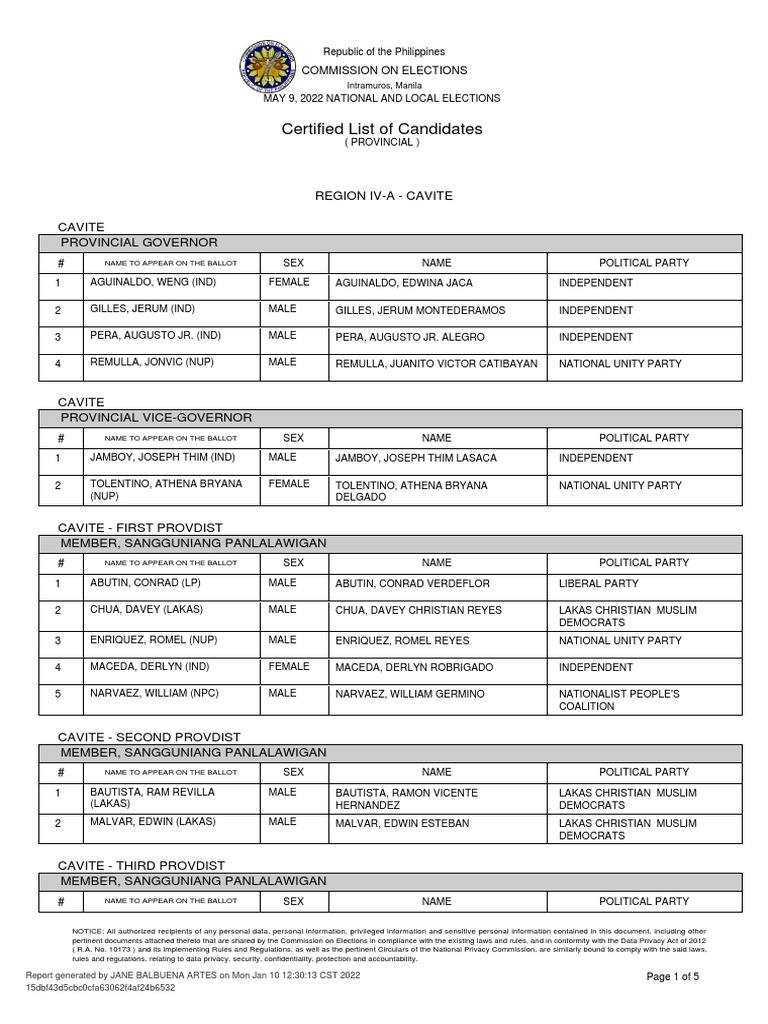 This is to certify that the above listed persons are the official candidates for the MAY 9, 2022 NATIONAL AND LOCAL ELECTIONS who filed their