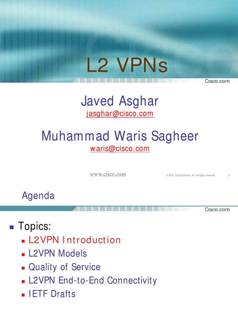 L2VPN Introduction L2VPN Models Quality of Service Tunnel Stitching IETF drafts Summary