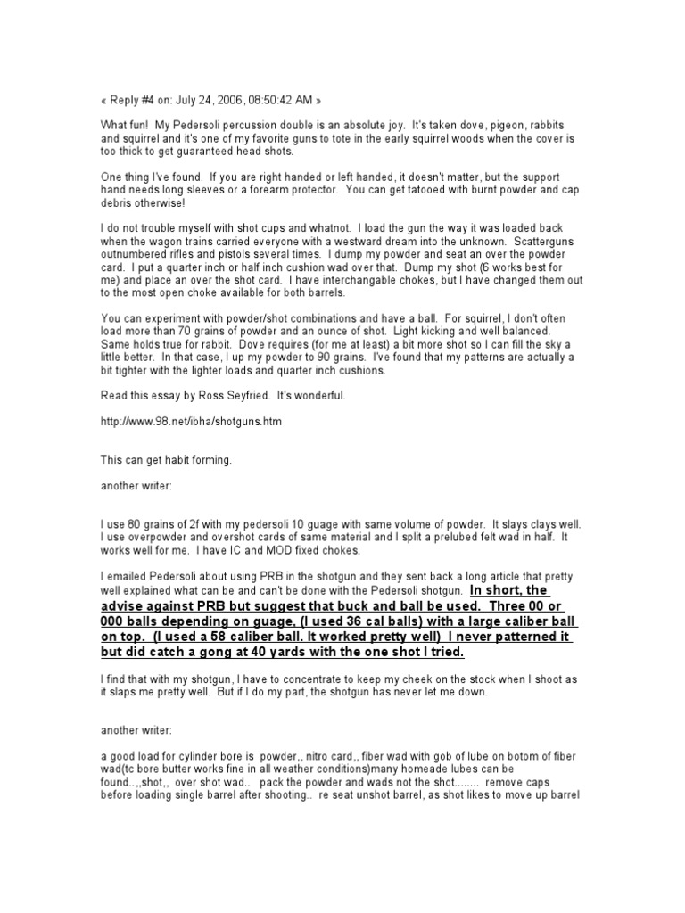 . It's taken dove, pigeon, rabbits and squirrel and it's one of my favorite guns to tote in the early squirrel woods when the cover is too thick to get guaranteed head shots. One thing I've found. If you are right handed or left handed, it doesn't matter, but the support hand needs long sleeves or a forearm protector. You can get tatooed with burnt powder and cap debris otherwise! I do not trouble myself with shot cups and whatnot. I load the gun the way it was loaded back when the wagon trains carried everyone with a westward dream into the unknown. Scatterguns outnumbered rifles and pistols several times. I dump my powder and seat an over the powder card. I put a quarter inch or half inch cushion wad over that. Dump my shot (6 works best for me) and place an over the shot card. I have interchangable chokes, but I have changed them out to the most open choke available for both barrels. You can experiment with powder/shot combinations and have a ball. For squirrel, I don't often load more than 70 grains of powder and an ounce of shot. Light kicking and well balanced. Same holds true for rabbit. Dove requires (for me at least) a bit more shot so I can fill the sky a little better. In that case, I up my powder to 90 grains. I've found that my patterns are actually a bit tighter with the lighter loads and quarter inch cushions. Read this essay by Ross Seyfried. It's wonderful. [Link] This can get habit forming. another writer: I use 80 grains of 2f with my pedersoli 10 guage with same volume of powder. It slays clays well. I use overpowder and overshot cards of same material and I split a prelubed felt wad in half. It works well for me. I have IC and MOD fixed chokes. I emailed Pedersoli about using PRB in the shotgun and they sent back a long article that pretty well explained what can be and can't be done with the Pedersoli shotgun. In short, the