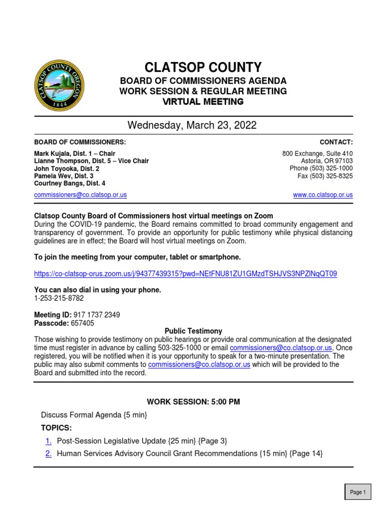 time must register in advance by calling 503-325-1000 or email commissioners@co.clatsop.or.us by 3 p.m. on