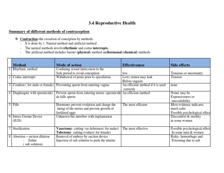 Summary of different methods of contraception
