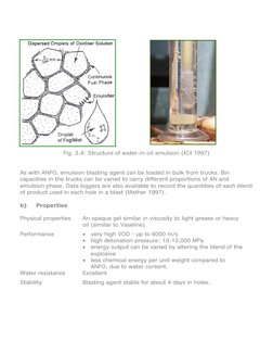 Fig. 3.4: Structure of water-in-oil emulsion (ICI 1997) As with ANFO, emulsion blasting agent can be loaded in bulk from trucks. Bin capacities in the trucks can be varied to carry different proportions of AN and emulsion phase. Data loggers are also available to record the quantities of each blend of product used in each hole in a blast (Mather 1997). b) Properties An opaque gel similar in viscosity to light grease or heavy oil (similar to Vaseline) very high VOD - up to 6000 m/s high detonation pressure: 10-12,000 MPa energy output can be varied by altering the blend of the explosive less chemical energy per unit weight compared to ANFO, due to water content. Excellent