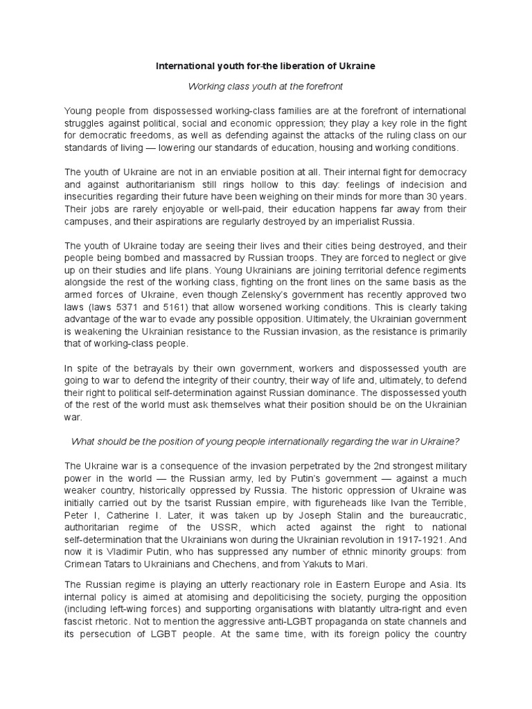 Young people are the generation that will live in this world for the longest, but we were never given a chance to decide how it works or to attempt to change it. In addition to fighting for our democratic rights, we must also build a world different from the one we were born into.May it be a world of liberation for young people, students, and workers.But to build a new world we have to be clear: ultimately, neither NATO, nor Russia, nor anybourgeois government will guarantee the rights and lives of young people and workers if thatgoes against their economic and political interests; on the contrary, they will attack them, aswe are currently seeing day after day. We can only guarantee our political independence bytaking the struggle into our own hands and advancing our political self-organization, as theUkrainian youth, students and workers are doing.Today, the primary task for young Ukrainians looking for the right to politicalself-determination (and many other rights) is to defeat the invading Russian troops. That iswhy we must carry out an international campaign of solidarity, bringing together young
