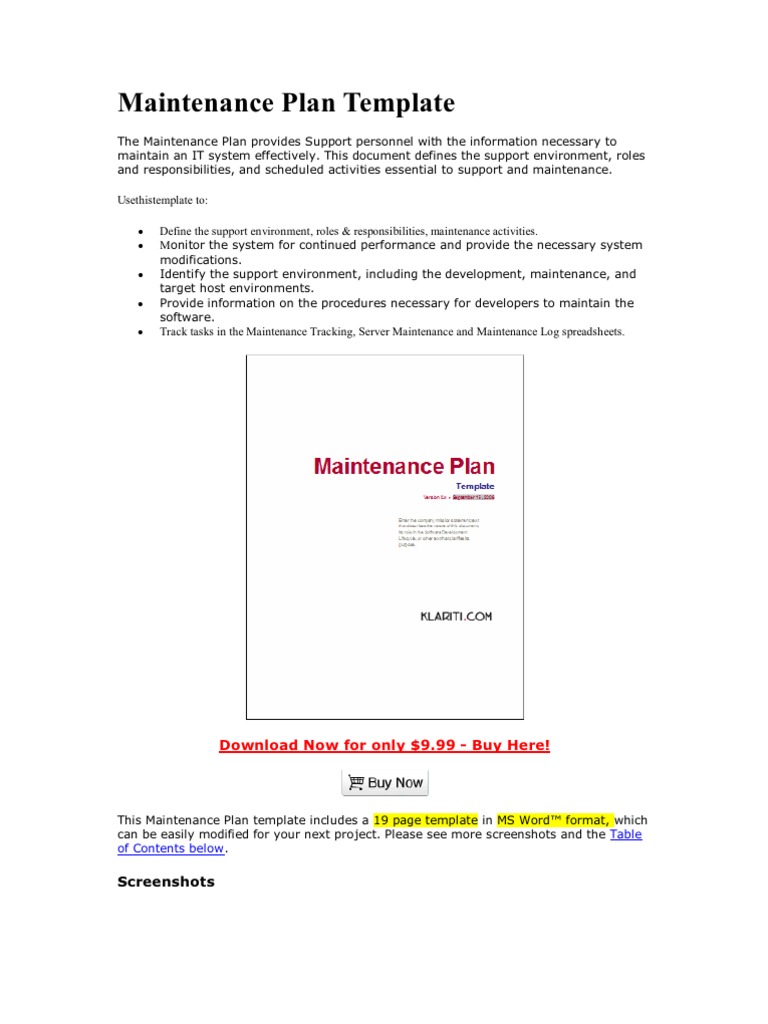 This Maintenance Plan template includes a 19 page template in MS Word format, which can be easily modified for your next project. Please see more screenshots and the Table of Contents below.