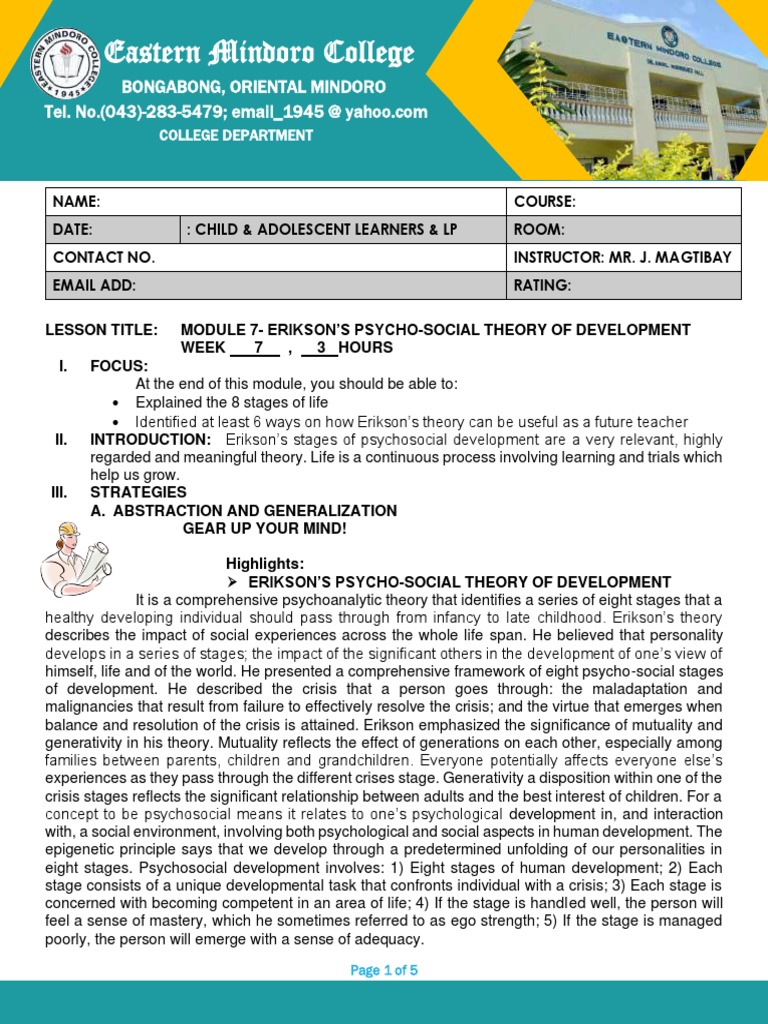 LESSON TITLE: MODULE 7- ERIKSON’S PSYCHO-SOCIAL THEORY OF DEVELOPMENT