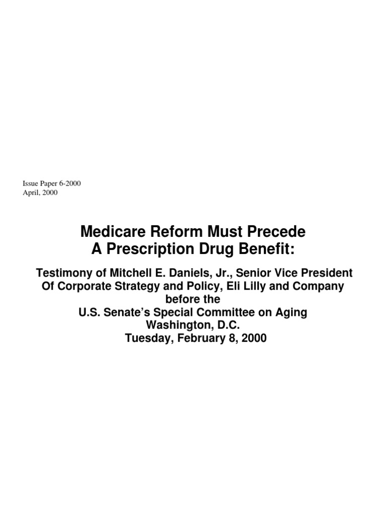 Testimony of Mitchell E. Daniels, Jr., Senior Vice-President of Corporate Strategy and Policy, Eli Lilly and Company, before the Special Committee on Aging of the U.S. Senate, Room 562, Dirksen Senate Office Building, Washington, D.C., 9:30 a.m., Tuesday, Feb. 8, 2000: Thank you, Mr. Chairman and Senator Breaux, for your invitation to be part of this forum. I wish to commend the Committee for engaging in these critically important issues. Your decisions about the future of Medicare and the addition of a prescription drug benefit will affect millions of Americans. We at Eli Lilly and Company applaud Senator Breauxs efforts to bring the outdated Medicare program into the twenty-first century. A great deal has changed since Lyndon Johnson signed Medicare into law 35 years ago, and the challenge is immense. Our basic goal, however, is relatively simple: we must focus on the best interests of the patient. While tremendous strides have been made in medical technology over the past 30 years, comparable progress has not been made in the Medicare benefit structure. When Medicare began in the 1960s, pharmaceutical cures were the exception, not the rule. Long hospital stays were much more common, and outpatient surgery was generally unimaginable. Many conditions easily managed today were largely untreatable then. Preventive care was virtually nonexistent. Medical advances of all kinds have allowed seniors to live significantly longer and healthier lives. Yet, as dramatic as these advances have been, we are on the brink of new discoveries that will bring even greater benefits. Fueled by advances in our understanding of the life sciences, these discoveries will dramatically improve doctors abilities to prevent illness and to heal and comfort those who suffer. It is imperative that we have in place a system that provides the benefit of these discoveries to the patients who need them. If Congress were enacting Medicare anew today, the program would bear no resemblance to its current form. Medicare was designed to guarantee quality health care for our senior citizens, but it is now disconnected, uncoordinated, inadequate, expensive, and unresponsive. The program has numerous design flaws and perverse incentives that would be unthinkable to someone designing a modern-day health plan. And Medicare beneficiaries suffer as a result. In many ways, Medicare fails seniors when they need protection the most. It does not include catastrophic coverage, hospital coverage decreases with length of stay, there are no long-term care benefits, it does not pay for most preventive care and its cost-sharing requirements are disjointed. And the first dollar coverage provided by supplemental insurance creates incentives for seniors to utilize care inappropriately. The claims review and appeals process for denied claims is interminable 524 days on average and its regulatory burden is absurd. Unbelievably, Medicares rules and regulations are more voluminous than the tax code and pervade every sector of the medical system. For Medicare providers, innovation, efficiency, and quality are discouraged. Mastering the bureaucratic system is the more essential skill. 2