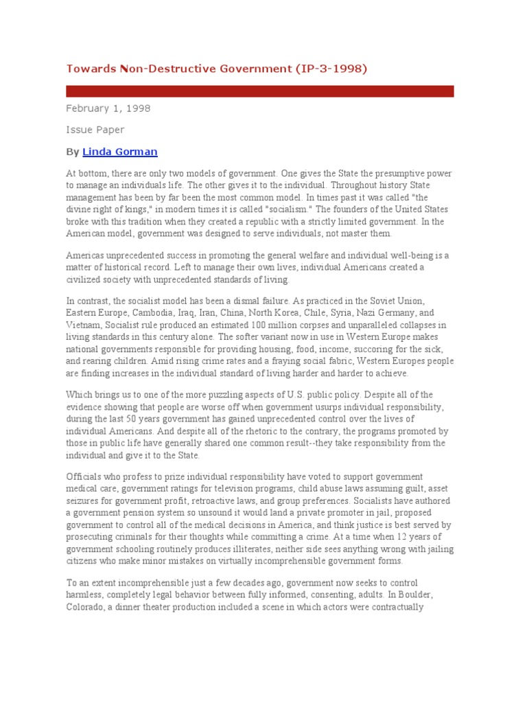 February 1, 1998 Issue Paper By Linda Gorman At bottom, there are only two models of government. One gives the State the presumptive power to manage an individuals life. The other gives it to the individual. Throughout history State management has been by far been the most common model. In times past it was called "the divine right of kings," in modern times it is called "socialism." The founders of the United States broke with this tradition when they created a republic with a strictly limited government. In the American model, government was designed to serve individuals, not master them. Americas unprecedented success in promoting the general welfare and individual well-being is a matter of historical record. Left to manage their own lives, individual Americans created a civilized society with unprecedented standards of living. In contrast, the socialist model has been a dismal failure. As practiced in the Soviet Union, Eastern Europe, Cambodia, Iraq, Iran, China, North Korea, Chile, Syria, Nazi Germany, and Vietnam, Socialist rule produced an estimated 100 million corpses and unparalleled collapses in living standards in this century alone. The softer variant now in use in Western Europe makes national governments responsible for providing housing, food, income, succoring for the sick, and rearing children. Amid rising crime rates and a fraying social fabric, Western Europes people are finding increases in the individual standard of living harder and harder to achieve. Which brings us to one of the more puzzling aspects of U.S. public policy. Despite all of the evidence showing that people are worse off when government usurps individual responsibility, during the last 50 years government has gained unprecedented control over the lives of individual Americans. And despite all of the rhetoric to the contrary, the programs promoted by those in public life have generally shared one common result--they take responsibility from the individual and give it to the State. Officials who profess to prize individual responsibility have voted to support government medical care, government ratings for television programs, child abuse laws assuming guilt, asset seizures for government profit, retroactive laws, and group preferences. Socialists have authored a government pension system so unsound it would land a private promoter in jail, proposed government to control all of the medical decisions in America, and think justice is best served by prosecuting criminals for their thoughts while committing a crime. At a time when 12 years of government schooling routinely produces illiterates, neither side sees anything wrong with jailing citizens who make minor mistakes on virtually incomprehensible government forms. To an extent incomprehensible just a few decades ago, government now seeks to control harmless, completely legal behavior between fully informed, consenting, adults. In Boulder, Colorado, a dinner theater production included a scene in which actors were contractually