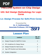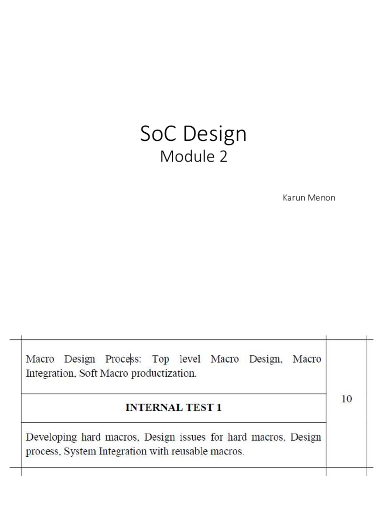 The document discusses the design process for system-on-chip (SoC) modules, including: - The macro design process involves specification, partitioning into subblocks, designing and verifying subblocks, and integrating and verifying the overall macro. - Good IP modules are configurable, have standard interfaces, follow defensive design practices, and provide complete deliverables for integration. - Complete deliverables for a macro include synthesizable RTL, verification IP, documentation, and synthesis scripts.