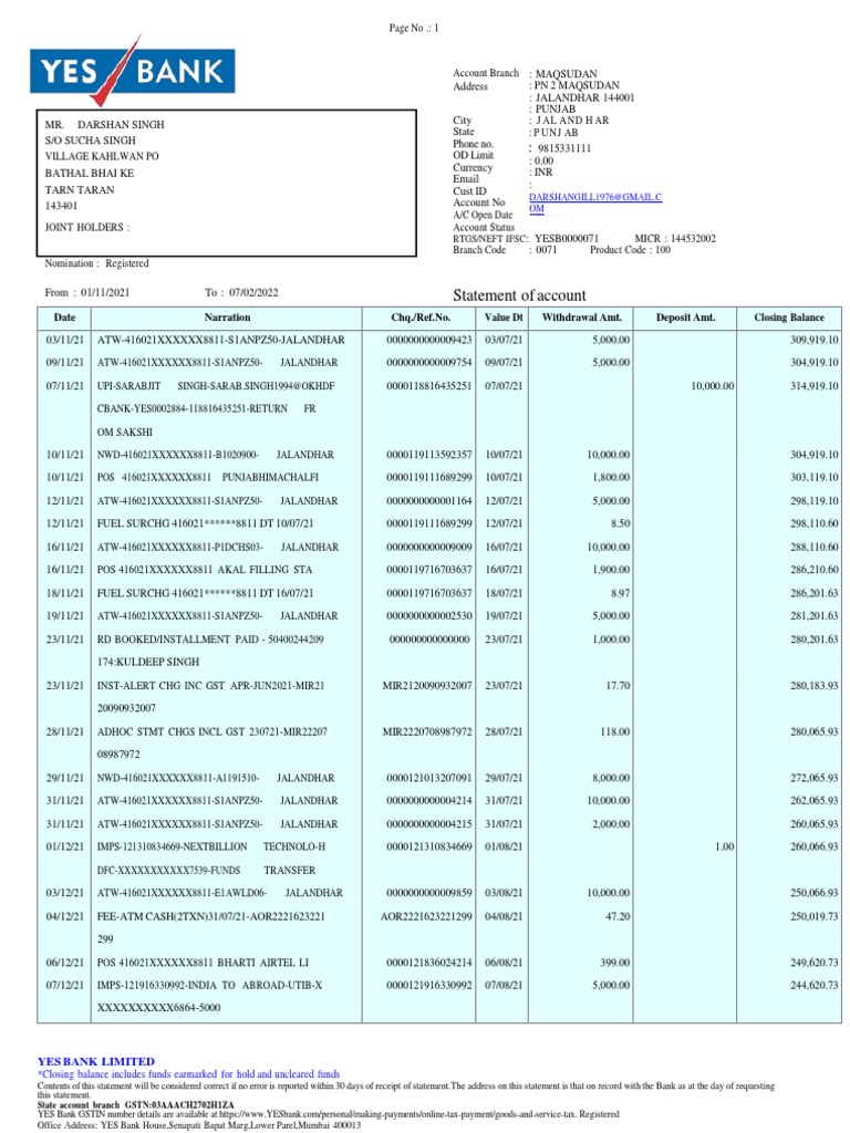 23/01/22 IMPS-126615382235-RANJEET KAUR-YES-XXXX 0000126615382235 23/09/21 45,000.00 448,836.10