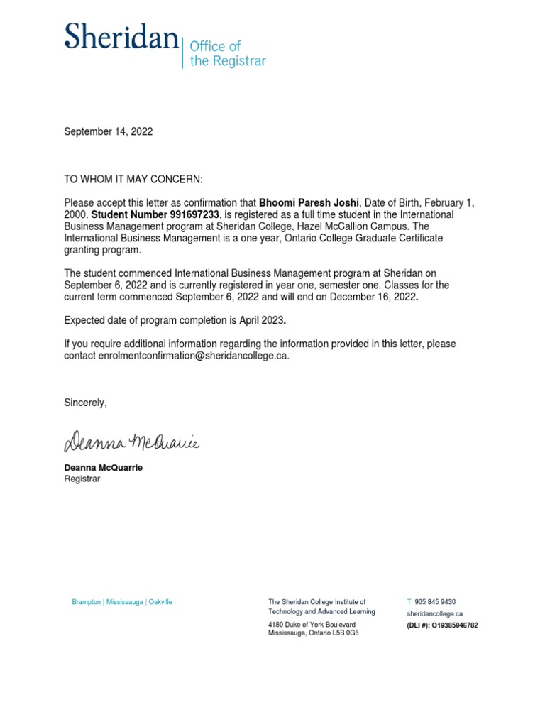 Please accept this letter as confirmation that Bhoomi Paresh Joshi, Date of Birth, February 1,