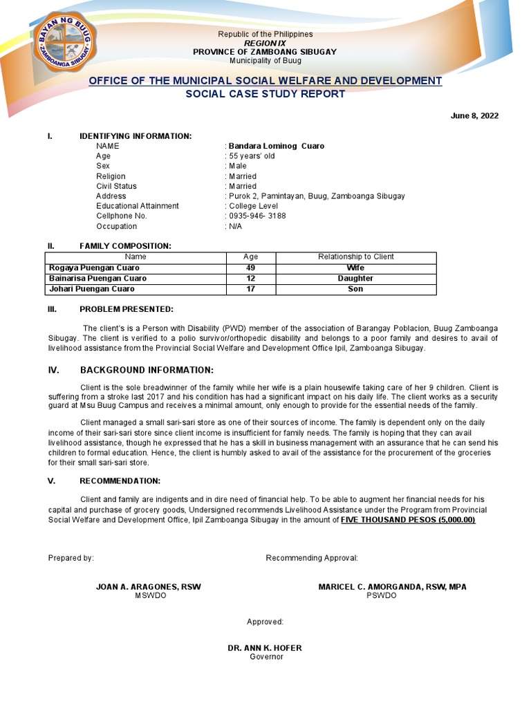 The client’s is a Person with Disability (PWD) member of the association of Barangay Poblacion, Buug Zamboanga
