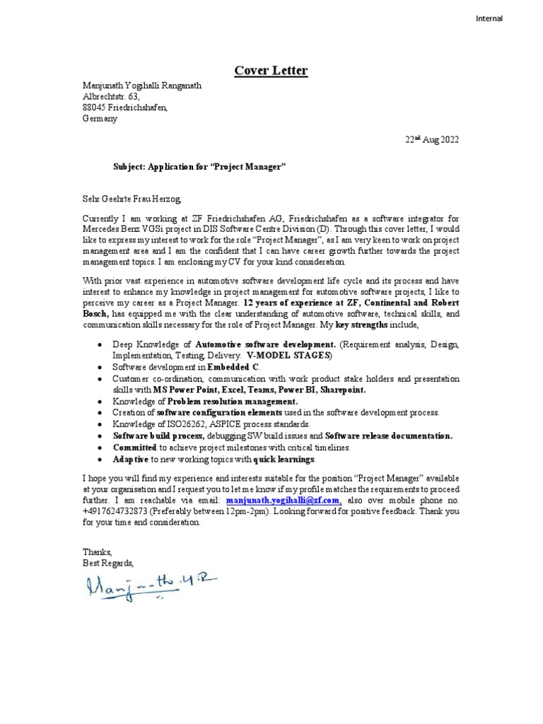 Mercedes Benz VGSi project in DIS Software Centre Division (D). Through this cover letter, I would