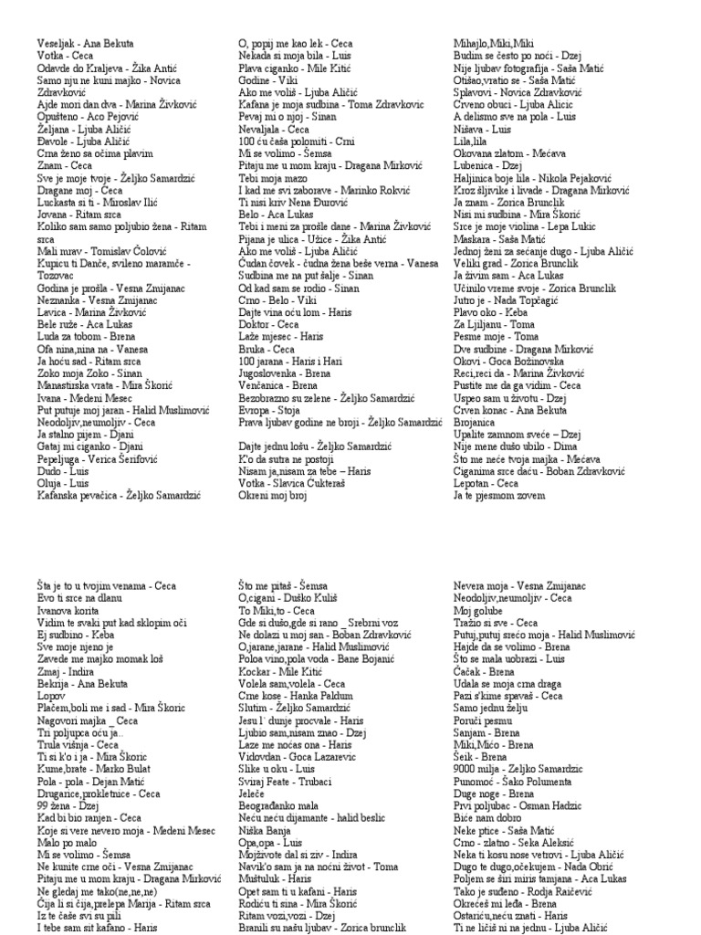 O,cigani – Duško Kuliš Mile voli disco – Brena O,kako boli me – Haris