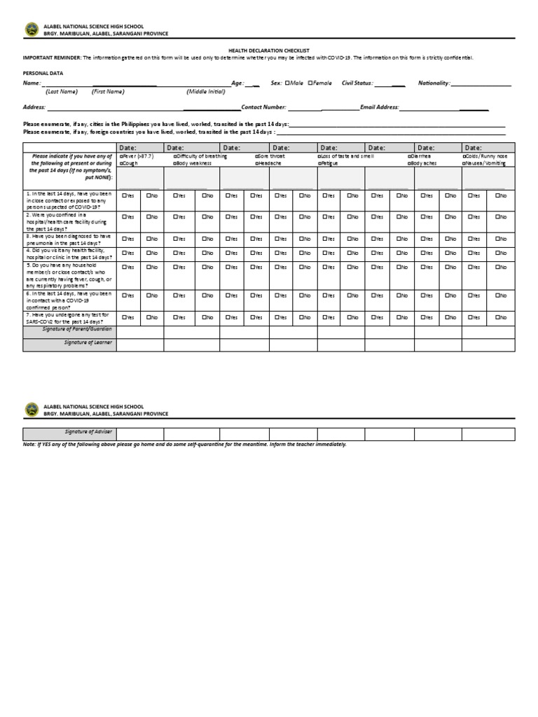 Note: If YES any of the following above please go home and do some self-quarantine for the meantime. Inform the teacher immediately.