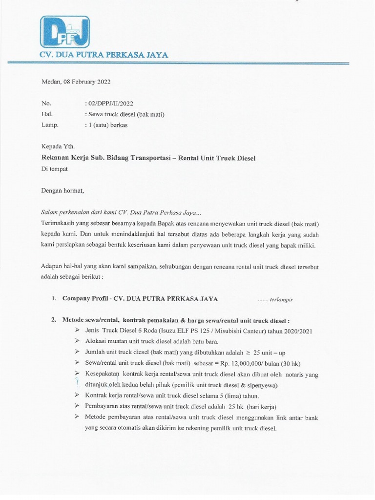 Demikianlah surat ini kami sampaikan kepada Bapak, besar harapan kami kontrak kerja unit truck diesel