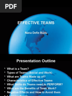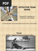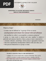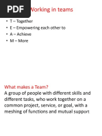 COMMITMENT Team members see themselves as belonging to a team rather than as individuals who operate autonomously. They are committed to group goals above and behind their personal goals. TRUST Team members have faith in each other to honor their commitments, maintain confidences, support each other, and generally behave in a consistent and predictably acceptable fashion. PURPOSE The team understands how it fits into the overall business of the organization. Team members know their roles, feel a sense of ownership, and can see how they make a difference. COMMUNICATION Communication refers to the style and extent of interactions both among members and between members and those outside the team. It also refers to the way that members handle conflict, decision making, and day-to-day interactions. INVOLVEMENT Everyone has a role in the team. Despite differences, team members must feel a sense of partnership with each other. Contributions are respected and solicited, and a real consensus is established before committing the team to action. PROCESS ORIENTATION Once a team has a clear purpose (why its together and where its going), it must have a process or means to get there. The process should include problem-solving tools, planning techniques, regular meeting, meeting agendas and minutes, and accepted ways of dealing with problems.