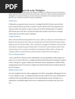 Teamwork is an important aspect that should be provided by both employers and employees. In today's work environment, the concept of working together to get an assignment done is as nonexistent as co- workers becoming acquainted outside the workplace. When a person is faced with co-workers who don't want to work, he or she ends up having to do work that others fail to complete or start an assignment over because someone did not do it right. It can be stressful and downright disgraceful because not only does the department work ethics look bad on the employees, but to the company as well. There are certain characteristics to remember when knowing the values of teamwork. The most important factor in teamwork is foundation. Knowing which position each person is within a team can help co-workers provide the work they're strong in; that way assignments can be completed on time and without problems. Having respect for one another is also very important. No one would want to work with someone that is rude and insensitive towards everyone in the office. Being able to show discipline and professionalism can provide imperative discussions that can help the work environment run smoothly. Finally, if a problem arises in a department, don't hesitate to speak up on the issue. One of the main reasons co-workers failed to work as a team because people do not voice their opinions on certain matters. Being quiet and reserve does not always work in the workplace; try gaining a voice because people will respect you more if you express your ideas.