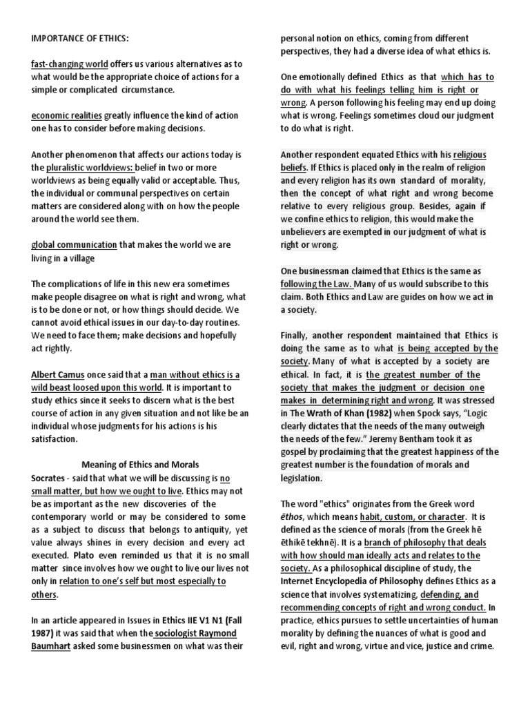 IMPORTANCE OF ETHICS: personal notion on ethics, coming from different