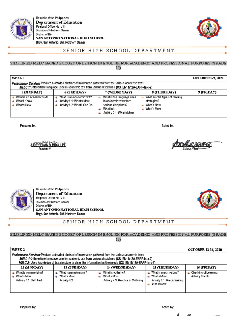 SIMPLIFIED MELC-BASED BUDGET OF LESSON IN ENGLISH FOR ACADEMIC AND PROFESSIONAL PURPOSES (GRADE