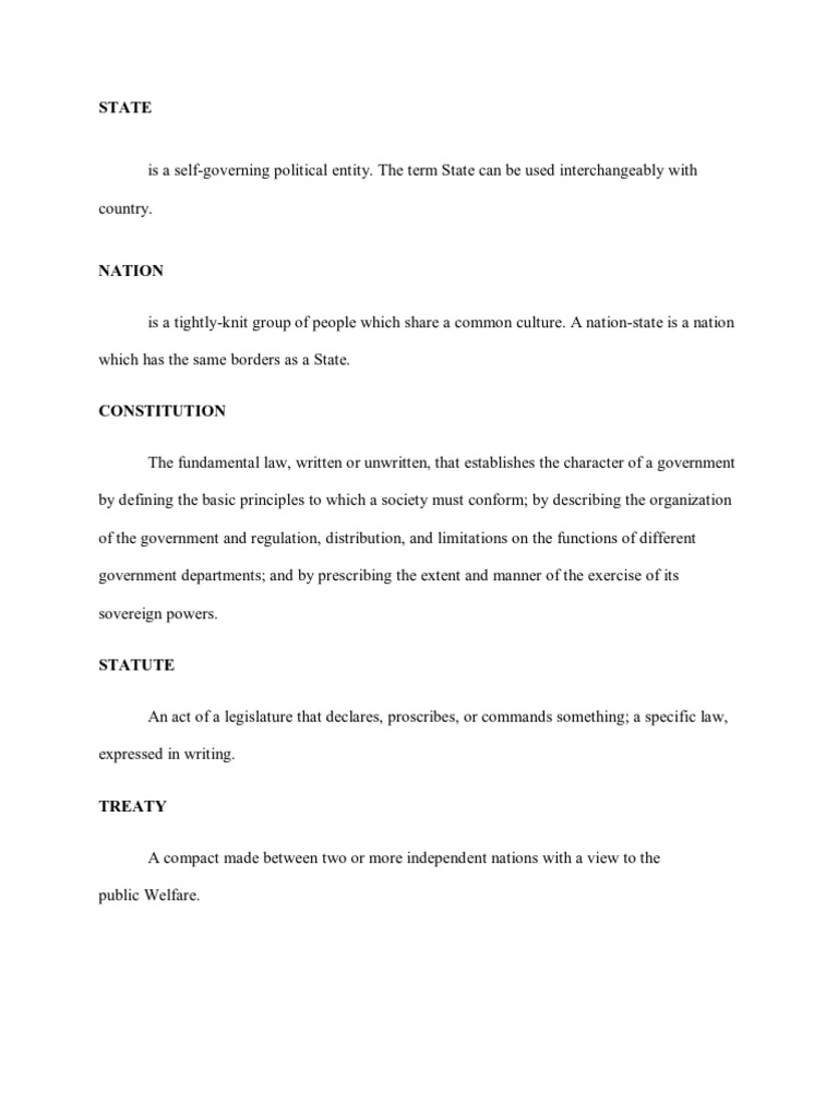 NATION is a tightly-knit group of people which share a common culture. A nation-state is a nation which has the same borders as a State. CONSTITUTION The fundamental law, written or unwritten, that establishes the character of a government by defining the basic principles to which a society must conform; by describing the organization of the government and regulation, distribution, and limitations on the functions of different government departments; and by prescribing the extent and manner of the exercise of its sovereign powers. STATUTE An act of a legislature that declares, proscribes, or commands something; a specific law, expressed in writing. TREATY A compact made between two or more independent nations with a view to the public Welfare.