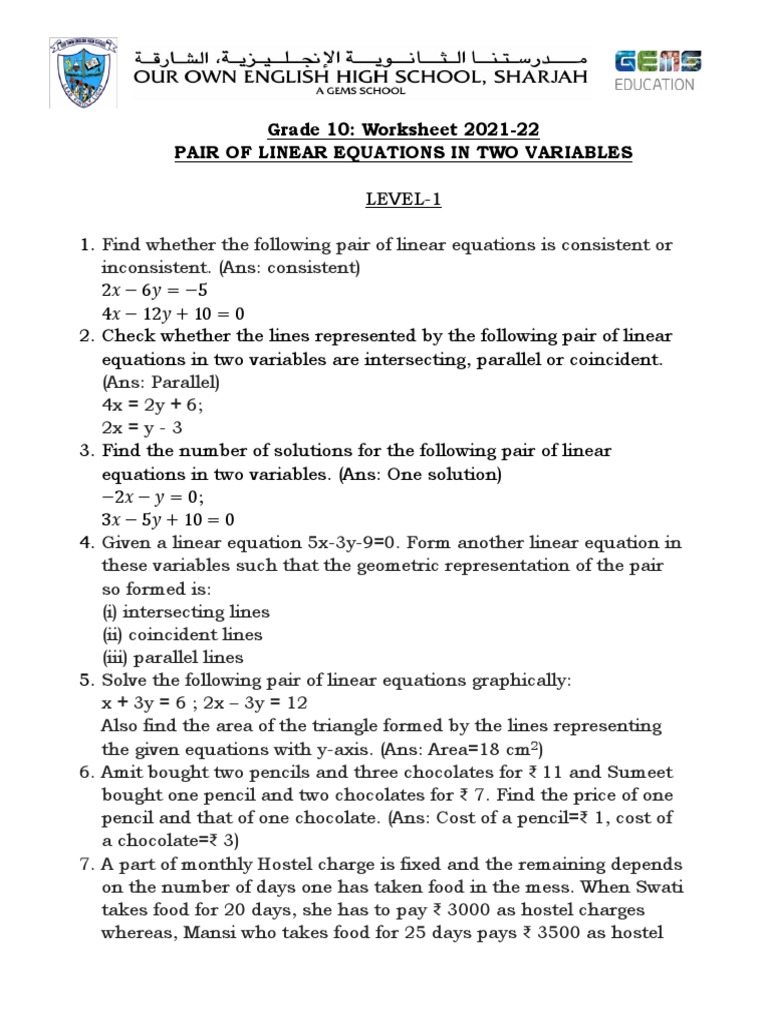 ACTIVITY-1: Pair of Linear Equations in two Variables.