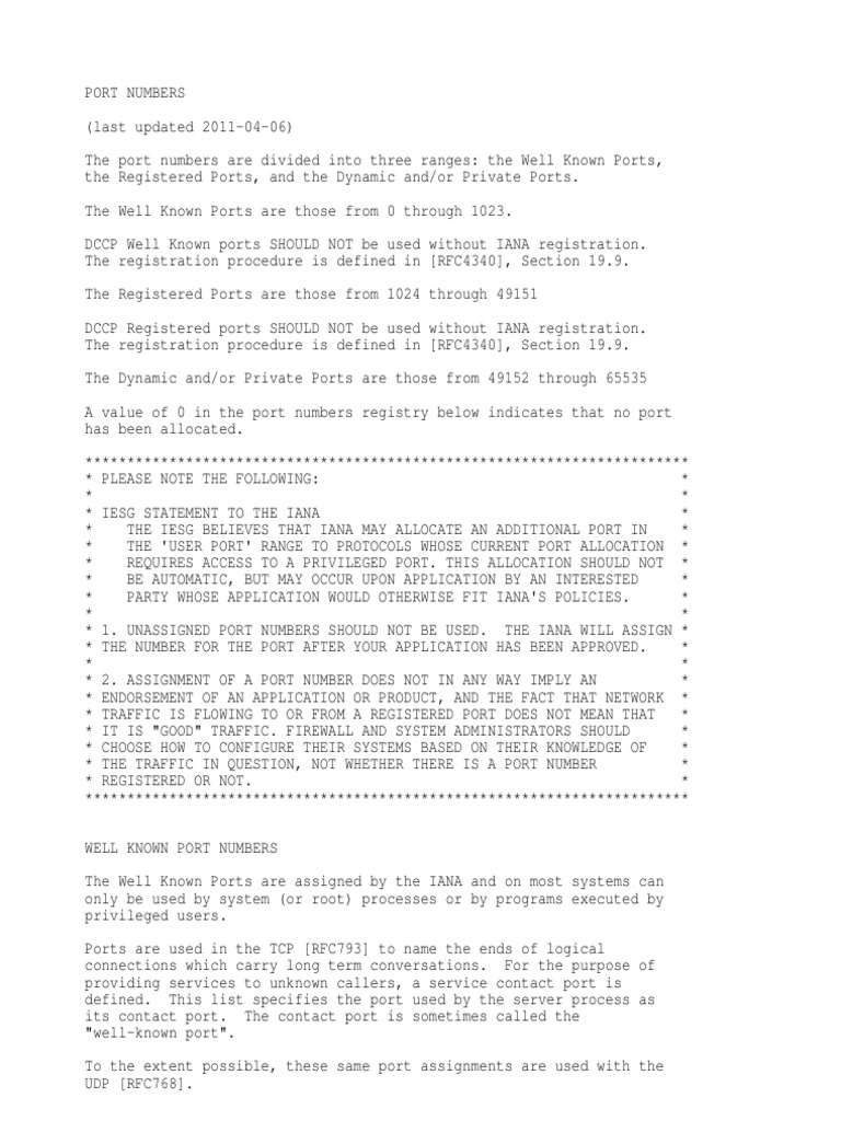 Known Ports, the Registered Ports, and the Dynamic and/or Private Ports. The Well Known Ports are those from 0 through 1023. DCCP Well Known ports SHOULD NOT be used without IANA registration. The registration procedure is defined in [RFC4340], Section 19.9. The Registered Ports are those from 1024 through 49151 DCCP Registered ports SHOULD NOT be used without IANA registration. The registration procedure is defined in [RFC4340], Section 19.9. The Dynamic and/or Private Ports are those from 49152 through 65535 A value of 0 in the port numbers registry below indicates that no port has been allocated. ************************************************************************ * PLEASE NOTE THE FOLLOWING: * * * * IESG STATEMENT TO THE IANA * * THE IESG BELIEVES THAT IANA MAY ALLOCATE AN ADDITIONAL PORT IN * * THE 'USER PORT' RANGE TO PROTOCOLS WHOSE CURRENT PORT ALLOCATION * * REQUIRES ACCESS TO A PRIVILEGED PORT. THIS ALLOCATION SHOULD NOT * * BE AUTOMATIC, BUT MAY OCCUR UPON APPLICATION BY AN INTERESTED * * PARTY WHOSE APPLICATION WOULD OTHERWISE FIT IANA'S POLICIES. * * * * 1. UNASSIGNED PORT NUMBERS SHOULD NOT BE USED. THE IANA WILL ASSIGN * * THE NUMBER FOR THE PORT AFTER YOUR APPLICATION HAS BEEN APPROVED. * * * * 2. ASSIGNMENT OF A PORT NUMBER DOES NOT IN ANY WAY IMPLY AN * * ENDORSEMENT OF AN APPLICATION OR PRODUCT, AND THE FACT THAT NETWORK * * TRAFFIC IS FLOWING TO OR FROM A REGISTERED PORT DOES NOT MEAN THAT * * IT IS "GOOD" TRAFFIC. FIREWALL AND SYSTEM ADMINISTRATORS SHOULD * * CHOOSE HOW TO CONFIGURE THEIR SYSTEMS BASED ON THEIR KNOWLEDGE OF * * THE TRAFFIC IN QUESTION, NOT WHETHER THERE IS A PORT NUMBER * * REGISTERED OR NOT. * ************************************************************************ WELL KNOWN PORT NUMBERS The Well Known Ports are assigned by the IANA and on most systems can only be used by system (or root) processes or by programs executed by privileged users. Ports are used in the TCP [RFC793] to name the ends of logical connections which carry long term conversations. For the purpose of providing services to unknown callers, a service contact port is defined. This list specifies the port used by the server process as its contact port. The contact port is sometimes called the "well-known port". To the extent possible, these same port assignments are used with the UDP [RFC768].