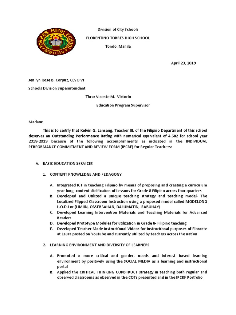 This is to certify that Kelvin G. Lansang, Teacher III, of the Filipino Department of this school