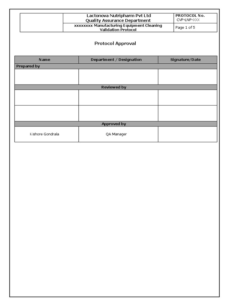 This protocol is prepared for cleaning validation of manufacturing equipment’s used for xxxxx xx in
