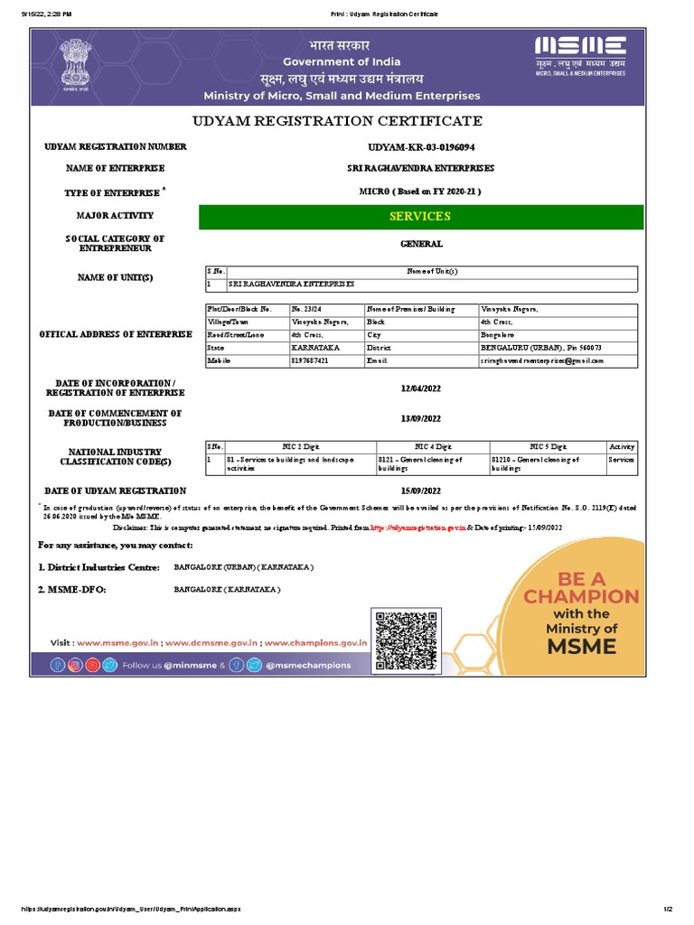 9/15/22, 2:28 PM Print : Udyam Registration Certificate