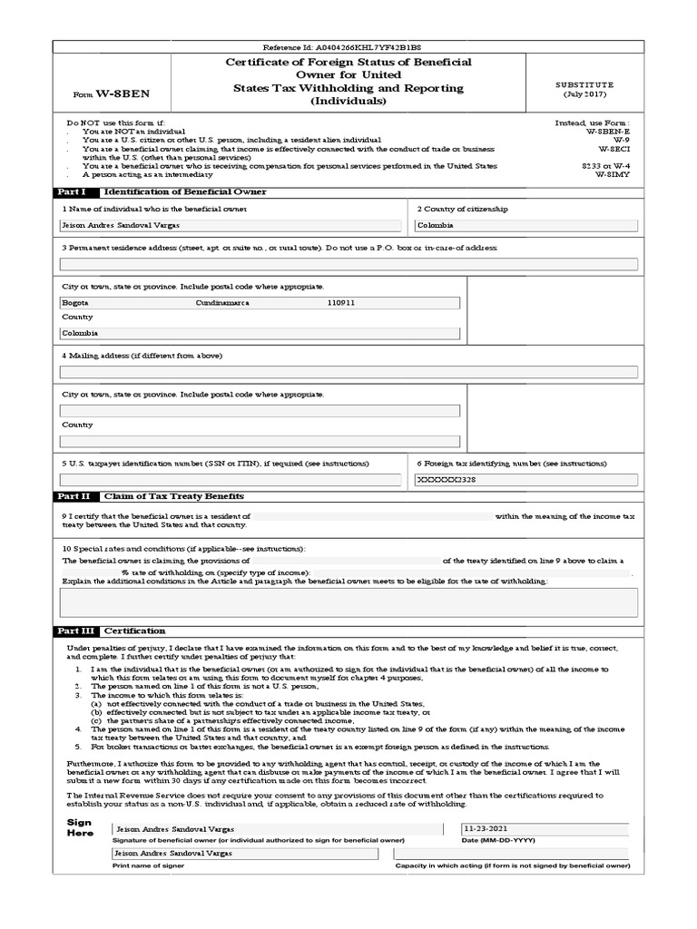 Furthermore, I authorize this form to be provided to any withholding agent that has control, receipt, or custody of the income of which I am the