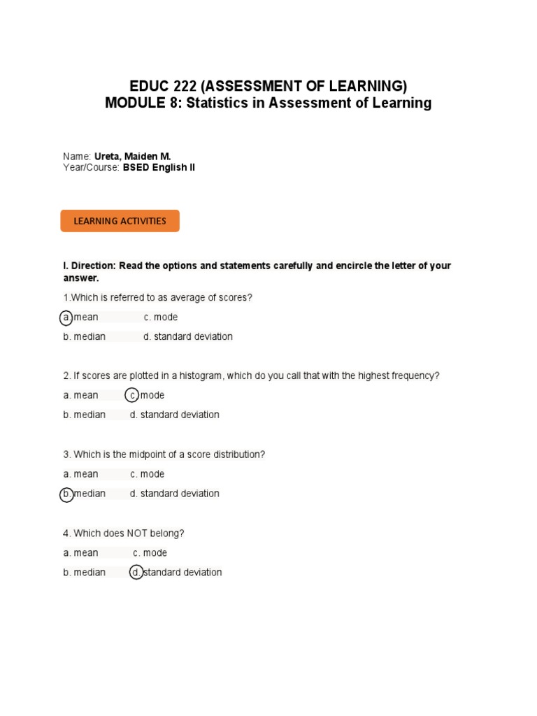 EDUC 222 (ASSESSMENT OF LEARNING)
