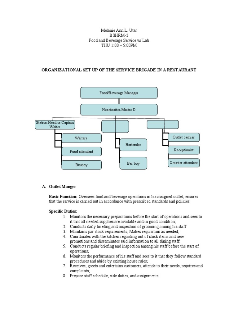 A. Outlet Manger Basic Function: Oversees food and beverage operations in his assigned outlet; ensures that the service is carried out in accordance with prescribed standards and policies. Specific Duties: 1. Monitors the necessary preparations before the start of operations and sees to it that all needed supplies are available and in good condition; 2. Conducts daily briefing and inspection of grooming among his staff 3. Maintains par stock requirements; Makes requisition as needed; 4. Coordinates with the kitchen regarding out of stock items and new promotions and disseminates said information to all dining staff; 5. Conducts regular briefing and inspection among his staff before the start of operations; 6. Monitors the performance of his staff and sees to it that they follow standard procedures and abide by existing house rules; 7. Receives, greets and entertains customers, attends to their needs, requires and complaints; 8. Prepare staff schedule, side duties, and assignments;