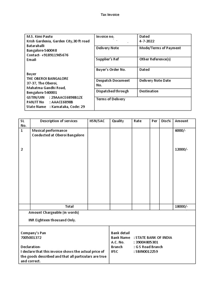SL Description of services HSN/SAC Quality Rate Per Disc% Amount