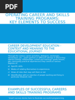 Technology: Effective workers select equipment and tools, apply technology to specific tasks and maintain and trouble shoot workplace technologies. Career development is the process through which an individual comes to understand his or her interests, knowledge, skills and aspirations and begins to make informed career decisions. The process consists, at a minimum, of (I) career awareness, (2) career exploration, (3) career planning/decision-making, and (4) career preparation. Students develop through a continuum of career awareness, career exploration and work exposure activities that help them discern their own career path.