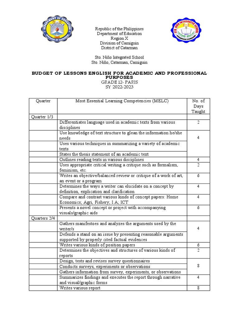 Quarter Most Essential Learning Competencies (MELC) No. of