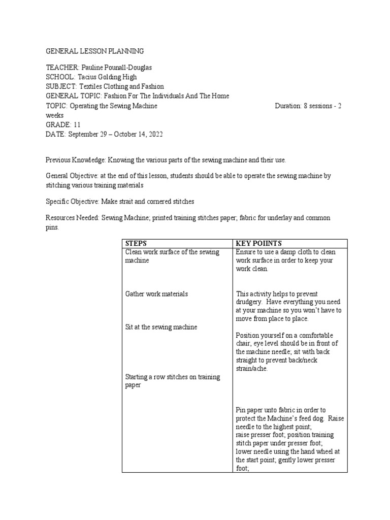 General Objective: at the end of this lesson, students should be able to operate the sewing machine by