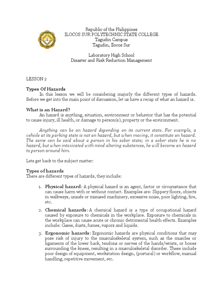 Direction: Make a signage to illustrate and avoid the 6 Major types of Hazards in our