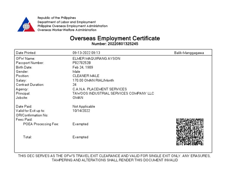 THIS OEC SERVES AS THE OFW'S TRAVEL EXIT CLEARANCE AND VALID FOR SINGLE EXIT ONLY. ANY ERASURES,