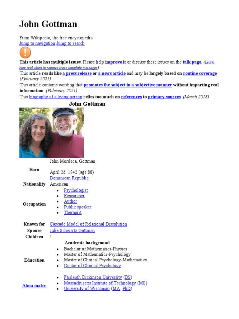 psychology at the University of Washington. His work focuses on divorce prediction and marital stability