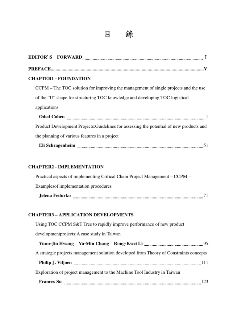 A strategic projects management solution developed from Theory of Constraints concepts Philip J. Viljoen Exploration of project management to the Machine Tool Industry in Taiwan Frances Su 123 111