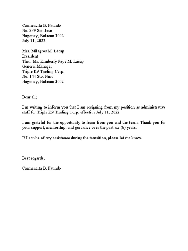 I’m writing to inform you that I am resigning from my position as administrative