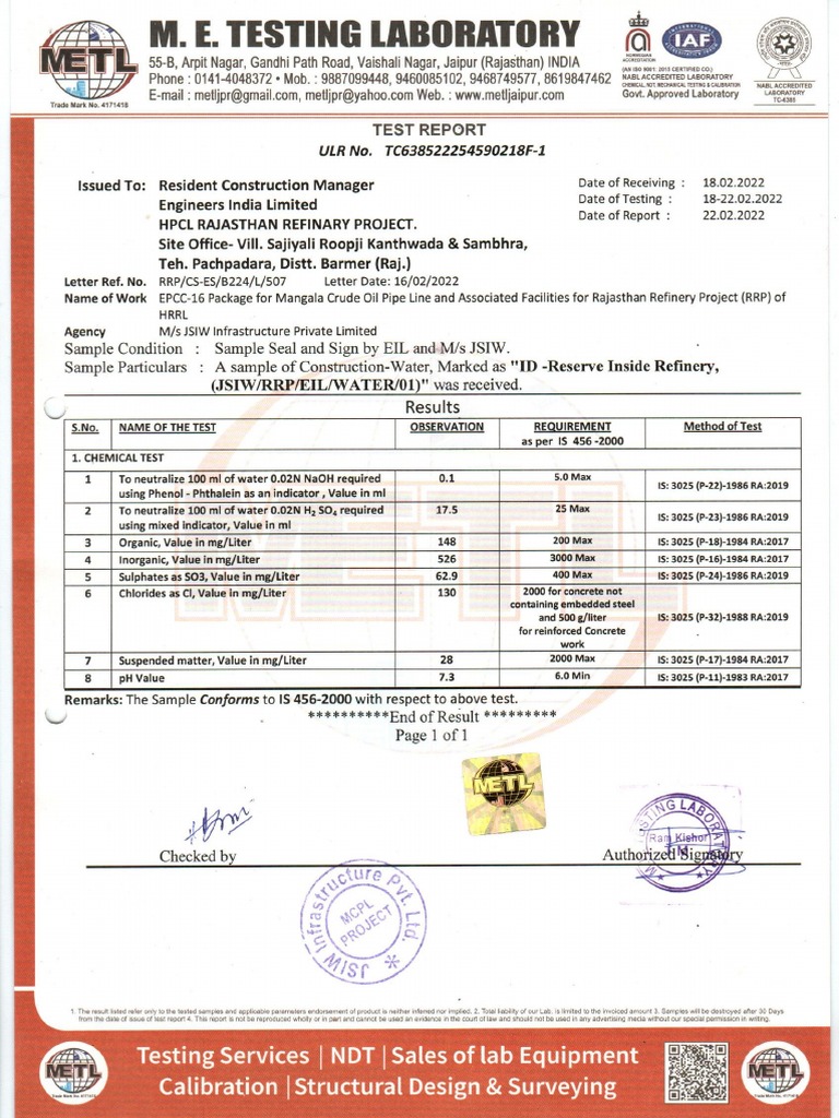 Engineers india Limited Date of Testing: 18-22.02.2022