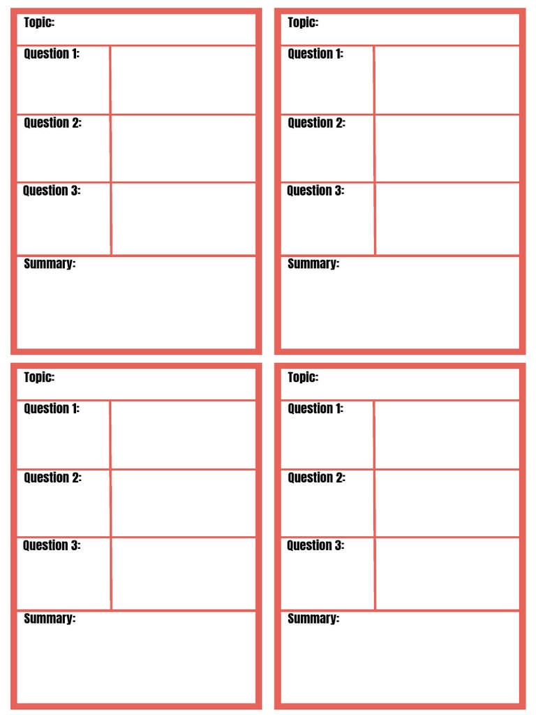 The document contains a series of topics followed by three questions each. However, the content of the questions and summaries is not provided. The overall structure suggests a format for organizing questions related to specific topics.