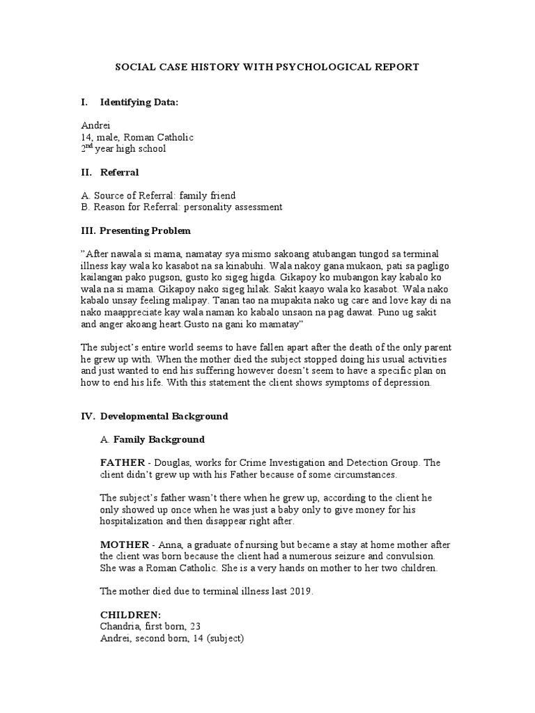 SOCIAL CASE HISTORY WITH PSYCHOLOGICAL REPORT