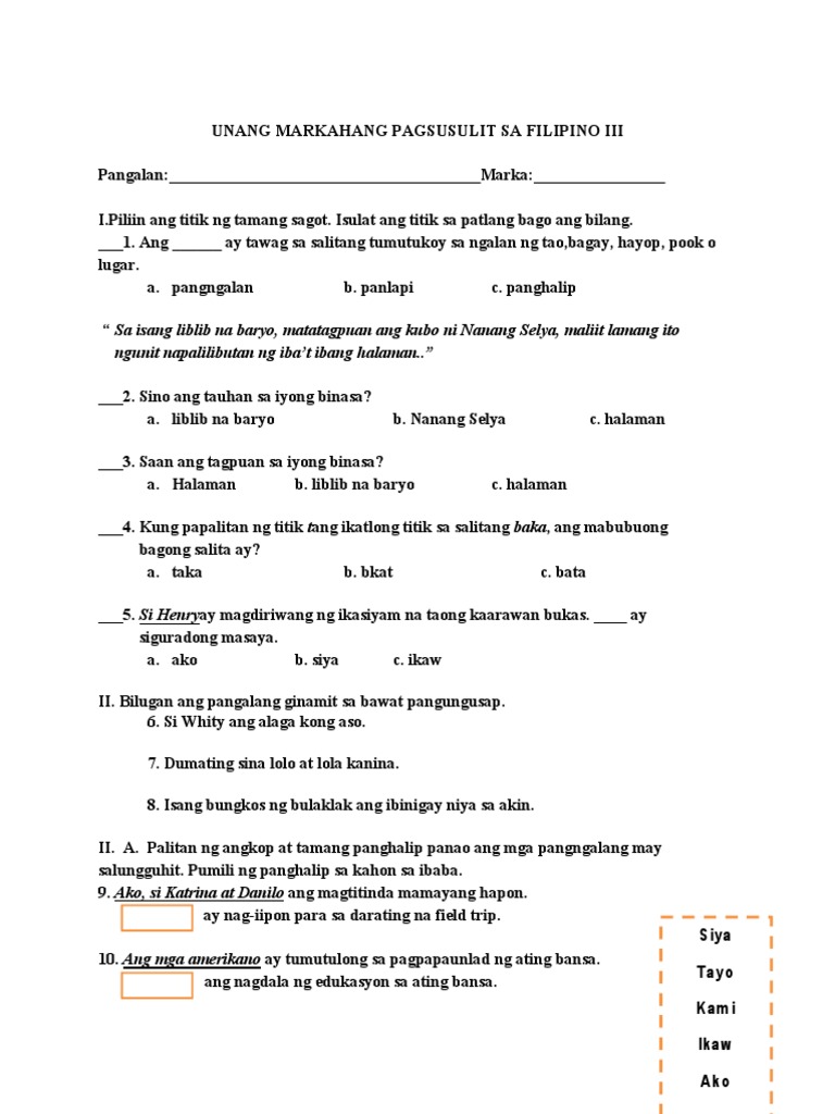 UNANG MARKAHANG PAGSUSULIT SA FILIPINO III