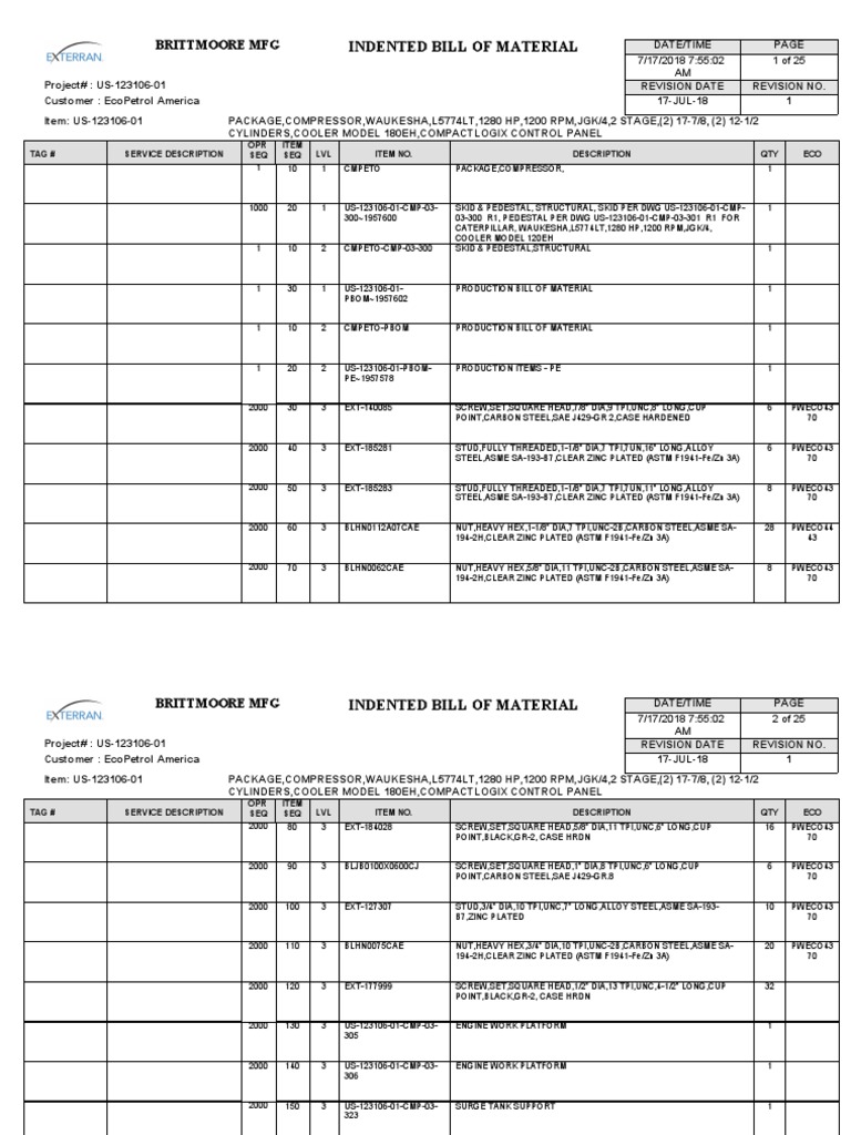 BRITTMOORE MFG INDENTED BILL OF MATERIAL DATE/TIME PAGE