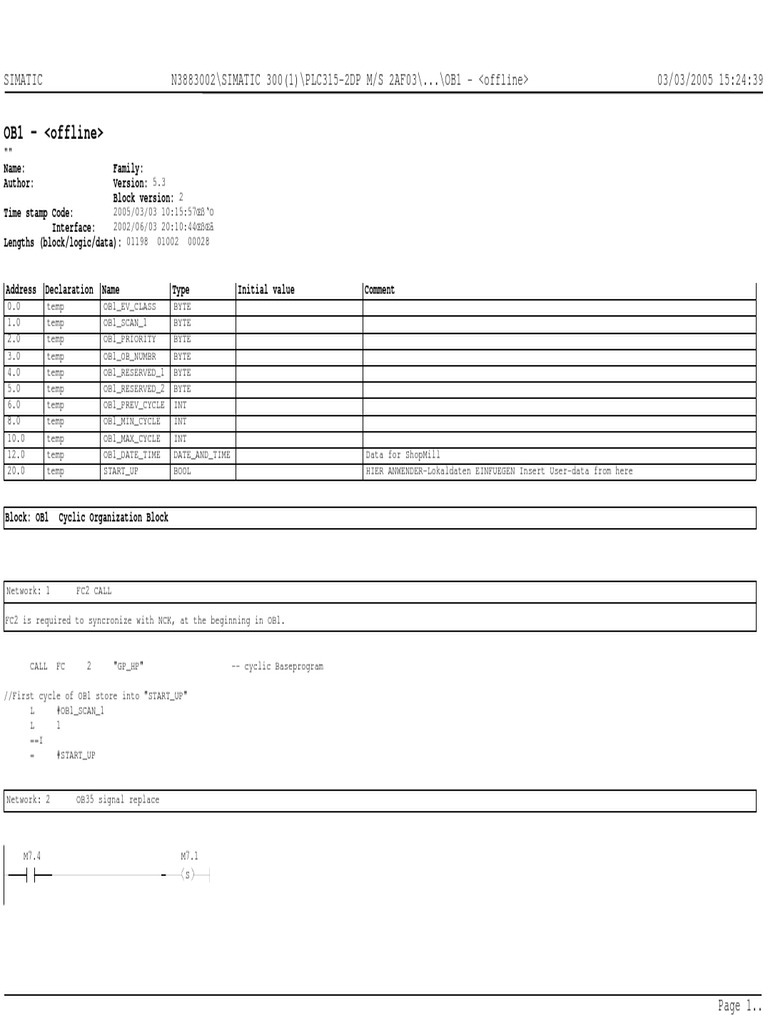 SIMATIC N3883002\SIMATIC 300(1)\PLC315-2DP M/S 2AF03\...\OB1 - <offline> 03/03/2005 15:24:39