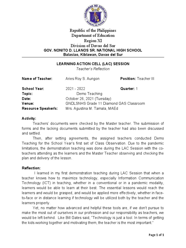 Name of Teacher: Aries Roy S. Aungon Position: Teacher III