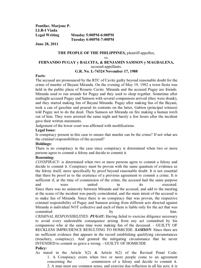 LLB-I Viada Legal Writing Monday 5:00PM-6:00PM Tuesday 6:00PM-7:00PM June 28, 2011 THE PEOPLE OF THE PHILIPPINES, plaintiff-appellee, vs. FERNANDO PUGAY y BALCITA, & BENJAMIN SAMSON y MAGDALENA, accused-appellants. G.R. No. L-74324 November 17, 1988 Facts: The accused are pronounced by the RTC of Cavite guilty beyond reasonable doubt for the crime of murder of Bayani Miranda. On the evening of May 19, 1982 a town fiesta was held in the public plaza of Rosario Cavite. Miranda and the accused Pugay are friends. Miranda used to run errands for Pugay and they used to sleep together. Sometime after midnight accused Pugay and Samson with several companions arrived (they were drunk), and they started making fun of Bayani Miranda. Pugay after making fun of the Bayani, took a can of gasoline and poured its contents on the latter, Gabion (principal witness) told Pugay not to do the deed. Then Samson set Miranda on fire making a human torch out of him. They were arrested the same night and barely a few hours after the incident gave their written statements. Judgement of the lower court was affirmed with modifications. Legal Issue: Is conspiracy present in this case to ensure that murder can be the crime? If not what are the criminal responsibilities of the accused? Holdings: There is no conspiracy in the case since conspiracy is determined when two or more persons agree to commit a felony and decide to commit it. Reasoning: CONSPIRACY- is determined when two or more persons agree to commit a felony and decide to commit it. Conspiracy must be proven with the same quantum of evidence as the felony itself, more specifically by proof beyond reasonable doubt. It is not essential that there be proof as to the existence of a previous agreement to commit a crime. It is sufficient if, at the time of commission of the crime, the accused had the same purpose and were united in its executed. Since there was no animosity between Miranda and the accused, and add to the meeting at the scene of the incident was purely coincidental, and the main intent of the accused is to make fun of Miranda. Since there is no conspiracy that was proven, the respective criminal responsibility of Pugay and Samson arising from different acts directed against Miranda is individual NOT collective and each of them is liable only for the act that was committed by him. CRIMINAL RESPONSIBILITIES: PUGAY: Having failed to exercise diligence necessary to avoid every undesirable consequence arising from any act committed by his companions who at the same time were making fun of the deceased. - GUILTY OF RECKLESS IMPRUDENCE RESULTING TO HOMICIDE. SAMSON: Since there are no sufficient evidence that appears in the record establishing qualifying circumstances (treachery, conspiracy). And granted the mitigating circumstance that he never INTENDED to commit so grave a wrong. - GUILTY OF HOMICIDE Policy: As stated in the Article 3(2) & Article 8(2) of the Revised Penal Code. 1. A Conspiracy exists when two or more people come to an agreement concerning the commission of a felony and decide to commit it. 2. A man must use common sense, and exercise due reflection in all his acts; it is his duty to be cautious, careful and prudent, if not from instinct, then through fear of incurring punishment. Conspiracy may be implied from concerted action of the assailants in confronting the victim
