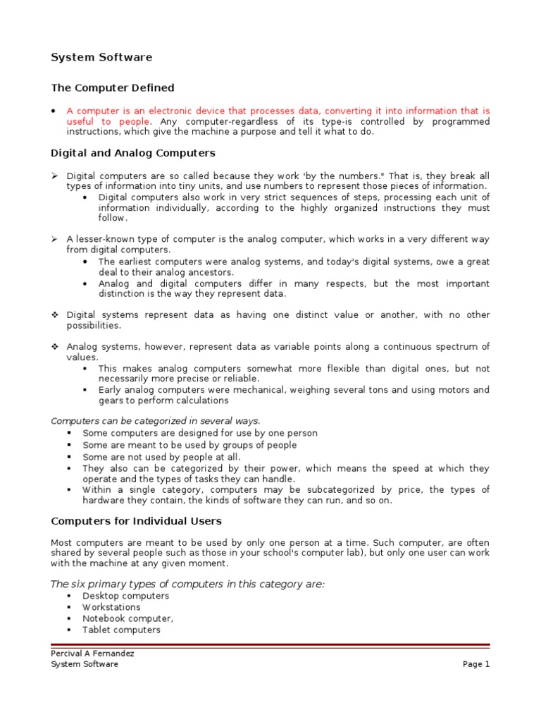 Digital systems represent data as having one distinct value or another, with no other possibilities. Analog systems, however, represent data as variable points along a continuous spectrum of values. This makes analog computers somewhat more flexible than digital ones, but not necessarily more precise or reliable. Early analog computers were mechanical, weighing several tons and using motors and gears to perform calculations Computers can be categorized in several ways. Some computers are designed for use by one person Some are meant to be used by groups of people Some are not used by people at all. They also can be categorized by their power, which means the speed at which they operate and the types of tasks they can handle. Within a single category, computers may be subcategorized by price, the types of hardware they contain, the kinds of software they can run, and so on.
